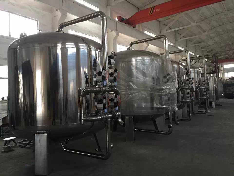 活性炭過濾器上部設(shè)有進水裝置,下部設(shè)有排水裝置,運行時,水經(jīng)上部進入,流經(jīng)活性炭過濾層,從底部流出。利用活性炭的表面有大量的羥基等官能團,可以對各種性質(zhì)的物質(zhì)進行化學(xué)吸附,除去水體中異味、有機物、膠體、鐵及余氯等,同時降低水體的濁度、色度,使水質(zhì)清澈透明,減少對后續(xù)系統(tǒng)(反滲透、超濾、離子交換器)的污染。
